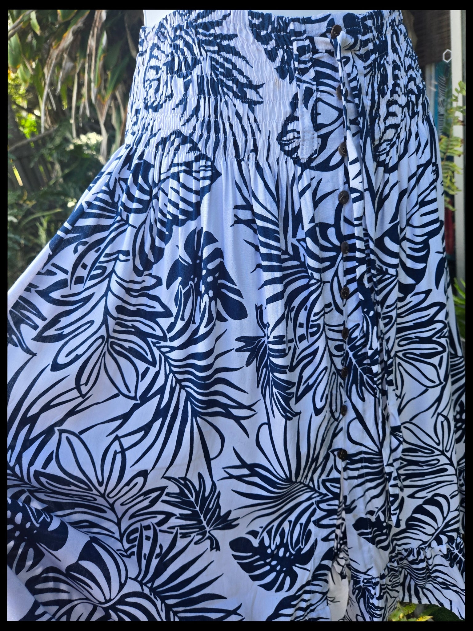 New season prints and colors have just arrived. This hugely popular skirt has been a winner since we started stocking it about 6 years ago. The wide shirred elastic waistband with faux drawstring makes it super comfortable to wear, and faux button front giving the look (and security) of a button front skirt. Wide ruffle at the slight hi-low hemline (which is flattering and doesn't make us shorties look shorter) will have you swishing about and feeling pretty.