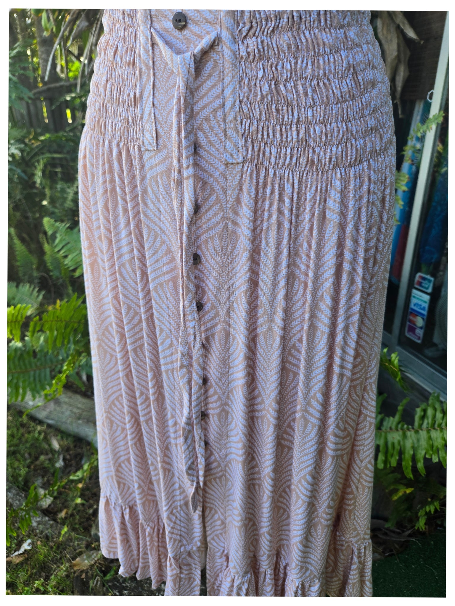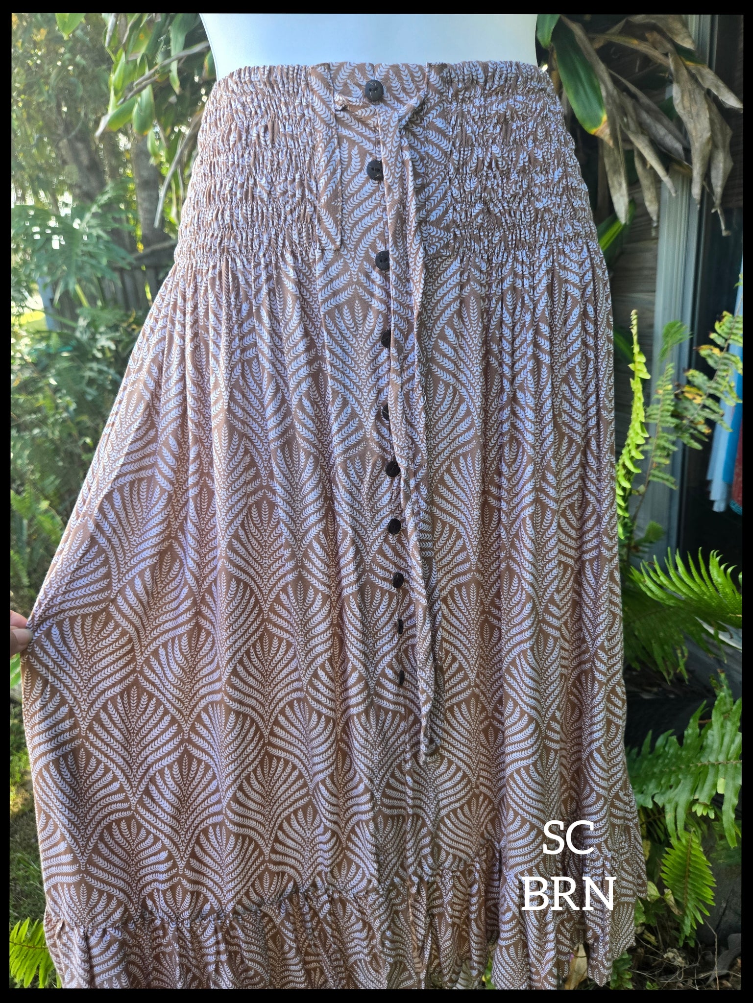 The wide shirred elastic waistband with faux drawstring makes it super comfortable to wear, and faux button front giving the look (and security) of a button front skirt. Wide ruffle at the slight hi-low hemline (which is flattering and doesn't make us shorties look shorter) will have you swishing about and feeling pretty.