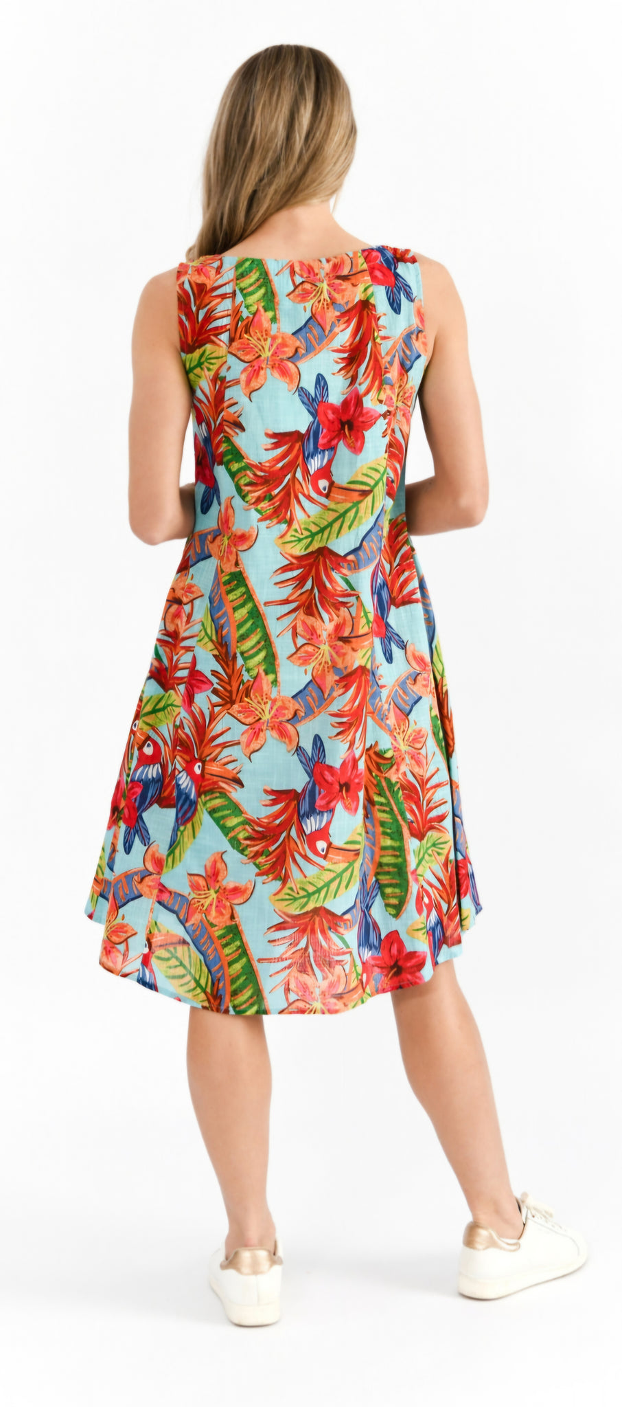 Easy, elegant, and endlessly wearable — the Estelle Sleeveless Dress is your go-to for warm-weather style. Made from 100% breathable cotton, this knee-length dress features a classic round neckline with soft gathers at the bust for a flattering touch. The button detailing adds subtle charm, while the sleeveless design keeps you cool and comfortable. Its relaxed A-line silhouette flows effortlessly with every step, and practical side pockets add functionality without compromising on style. Perfect for sunny days, laid-back evenings, or casual outings.